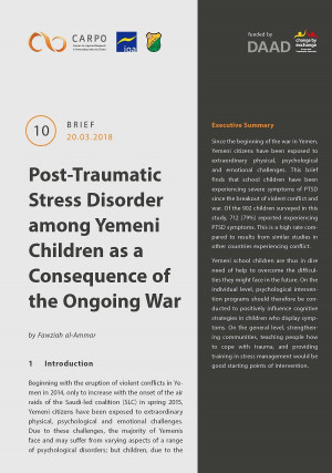 Dieser CARPO Brief fasst erste Forschungsergebnisse aus Untersuchungen der Autorin unter geflüchteten Schulkindern in Sana’a im Frühjahr 2016 zusammen, basierend auf der international anerkannten Child PTSD Symptoms Scale (CPSS). Sie kommt zu dem Ergebnis, dass diese Kinder seit Beginn des Konfliktes schwere Symptome von PTSD durchleben und dass die PTSD-Raten höher sind als im Vergleich zu Ergebnissen ähnlicher Studien aus anderen konfliktbetroffenen Ländern. Sie kommt daher zu dem Schluss, dass Kinder im Jemen dringend auf Hilfe angewiesen sind, um die psychischen Auswirkungen des Krieges auf ihre Zukunft abzumildern, und stellt entsprechende Empfehlungen zur Verfügung.